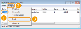 Uzak Kullanıcı Arabiriminden iptal etmeYazdırmayı Uzak Kullanıcı Arabirimindeki [İş Durumu] sayfasından iptal edebilirsiniz: Yazdırma Belgelerinin Geçerli Durumunu Denetleme