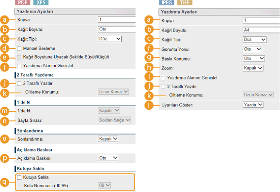 XPS dosyaları için yazdırma ayarlarını belirtirken[Yazdırma Fişine Öncelik Tanı] onay kutusunu temizleyin. Eğer bu onay kutusu işaretli ise, bazı öğeler kullanılamayabilir.