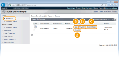 Ayrıntılı bilgileri görüntülemek için duraklatılan belgelerde ve güvenli belgelerde [İş No.] öğesini tıklatın. Yazdırılan belgenin kullanıcı adını ve sayfa sayısını denetleyebilirsiniz.