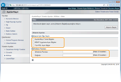 Portal sayfasındaki [Ayarlar/Kayıt] öğesiyle kurulabilir olan birimlerin ayar verilerini dışa aktarmak için, bu birimlere karşılık gelen onay kutularını işaretleyin.