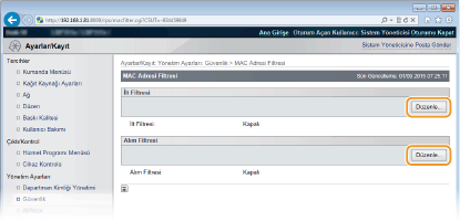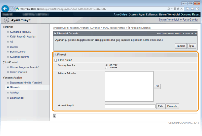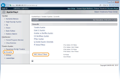 MAC adresleri yanlış şekilde girildiyse Uzak Kullanıcı Arabirimi'nden makineye erişemeyebilirsiniz ve bu durumda <Adres Filtresi> öğesini <Kapalı> olarak ayarlamanız gerekir. Adres Filtresi
