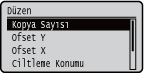 Her bir kağıt kaynağı için yazdırma konumunu ayrıntılı olarak belirtmek için, <Kullanıcı Bakımı> altındaki <Baskı Knmnu Ayarla> öğesini seçebilirsiniz. Kullanılabilen dengeleme değerleri için aralık başlangıcı -5,0 mm - +5,0 mm olarak tanımlanmıştır. Yazdırma Konumunun Ayarlanması