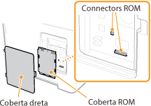 En aquesta secció es descriu com instal·lar el Kit d'impressió de codis de barres o Conjunt de fonts internacional PCL a l'equip. La ROM s'utilitza connectada als connectors ROM dins de la tapa dreta de l'equip. Llegiu les precaucions a Instal·lació abans d'instal·lar la ROM.
