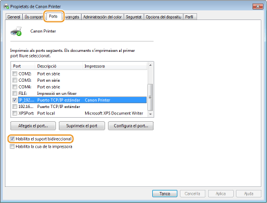 A la pestanya [Ports], assegureu-vos que la casella [Habilita el suport bidireccional] estigui marcada.