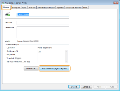 Feu clic a [Imprimeix una pàgina de prova] a la pestanya [General].