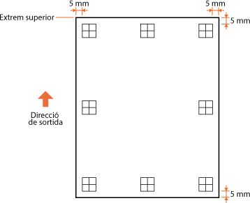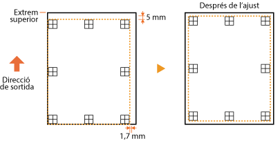 . Determineu la direcció i la distància per ajustar en funció d'aquestes marques. Quan la posició d'impressió és normal, totes les marques s'imprimeixen en una posició a 5 mm de la vora més propera del paper.