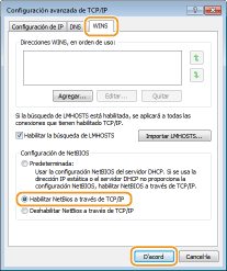 Feu clic a la pestanya [WINS], seleccioneu [Habiliteu NetBIOS a través de TCP / IP] i feu clic a [D'acord].