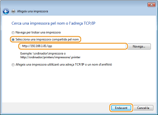 Seleccioneu [Selecciona una impressora compartida pel nom], inseriu una destinació de connexió i feu clic a [Següent].