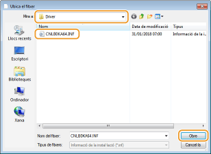 Especifiqueu la carpeta on hi ha desats els controladors, seleccioneu el fitxer INF i feu clic a [Obre].
