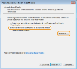 Seleccioneu [Col·locar tots els certificats a la botiga següent] i feu clic [Navega].