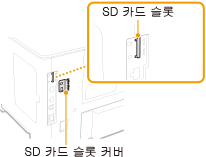 이 단원에서는 SD 카드를 탑재하고 초기화하는 방법에 대해 설명합니다. SD 카드를 기기 뒷면의 SD 카드 슬롯에 삽입합니다. SD 카드를 설치하기 전에 설치의 주의 사항을 읽어 보십시오. SD 카드에 저장된 기기의 데이터에는 모두 암호화가 적용됩니다. SD 카드의 암호화된 데이터는 무단 추출을 할 수 없도록 보호되기 때문에 컴퓨터 또는 기타 상황에서 SD 카드를 안전하게 사용할 수 있습니다. | ![]() |