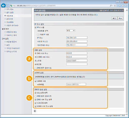 2 | IPv4 DNS 설정을 구성합니다. ![]() [DNS 설정][주 DNS 서버 주소] DNS 서버의 IP 주소를 입력합니다. 조작 패널에서도 IP 주소를 설정할 수 있습니다(IPv4 설정). [호스트명] DNS 서버에 등록할 기기의 호스트 이름으로 영숫자 문자를 입력합니다. [도메인명] 기기가 속한 도메인 이름에 대해 영숫자 문자를 입력합니다(예: "example.com"). [DNS 동적 업데이트] 기기의 IP 주소가 변경될 때마다 DNS 레코드를 동적으로 업데이트하려면 확인란을 선택합니다. [mDNS 설정][mDNS 사용] Bonjour에서 적용된 mDNS(multicast DNS)는 DNS를 사용하지 않고 호스트 이름을 IP 주소와 연계하는 프로토콜입니다. 확인란을 선택하여 mDNS를 활성화하고 [mDNS명] 텍스트 상자에 mDNS 이름을 입력합니다. 이 확인란은 [IPv4 사용] 확인란을 선택되었을 경우에만 선택 가능합니다. [DHCP 옵션 설정][호스트명 취득] DHCP 서버에서 호스트 이름을 획득하도록 옵션 12를 설정하려면 확인란을 선택합니다. 조작 패널에서도 호스트 이름 획득여부를 지정할 수 있습니다(IPv4 설정). [DNS 동적 업데이트] DHCP 서버를 통해 DNS 레코드를 동적으로 업데이트하도록 옵션 81을 활성화하려면 확인란을 선택합니다. 조작 패널에서도 DNS 동적 업데이트의 실행여부를 지정할 수 있습니다(IPv4 설정). [Acquire DNS Server Address] DHCP 서버에서 DNS 서버 주소를 획득하도록 옵션 6을 설정하려면 확인란을 선택합니다. [Acquire Domain Name] DHCP 서버에서 도메인 이름을 획득하도록 옵션 15를 설정하려면 확인란을 선택합니다. [Acquire WINS Server Address] DHCP 서버에서 WINS 서버 주소를 획득하도록 옵션 44를 설정하려면 확인란을 선택합니다. |