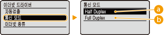 2 | 통신 모드를 선택합니다. <통신 모드> 선택 <Half Duplex> 또는 <Full Duplex> 선택 ![]() ![]() <Half Duplex>통신 데이터를 교대로 송수신 합니다. 기기가 반이중을 사용하는 네트워크 장치에 연결된 경우에 선택합니다. <Full Duplex>통신 데이터를 동시에 송수신 합니다. 대부분의 환경에서 이 설정을 사용합니다. |