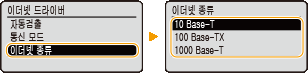 3 | 이더넷 유형을 선택합니다. <이더넷 종류> 선택 이더넷 유형 선택 ![]() ![]() ![]() <1000 Base-T> 를 선택하면, <통신 모드> 설정이 <Full Duplex> 로 바뀝니다. |