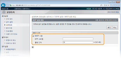 ![]() | SNTP(Simple Network Time Protocol)로, 네트워크의 시간 서버를 사용하여 시스템 시계를 조정할 수 있습니다. SNTP를 사용하는 경우, 시스템 시계가 항상 정확하도록 시스템이 주기적으로 시간 서버를 확인합니다. |