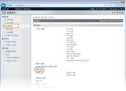SMB 네트워크는 TCP/IP에서 NetBIOS만을 지원하며 NetBEUI은 지원하지 않습니다. SMB 설정을 구성하기 전에 먼저 IP 주소를 구성하십시오. IP 주소 설정SMB는 옵션 SD 카드를 기기에 설치한 경우에 한해서만 활성화 됩니다. |