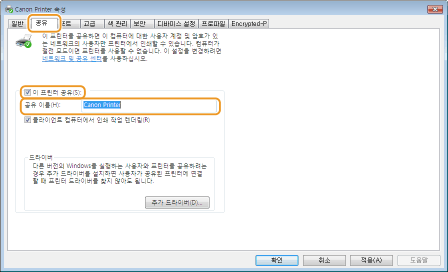 5 | [확인]을 클릭합니다. 추가 드라이버 설치가 시작됩니다. [공유] 탭이 다시 표시될 때까지 기다리십시오. ![]() [사용자 계정 컨트롤] 이 표시되는 경우 [예]를 클릭합니다. |
