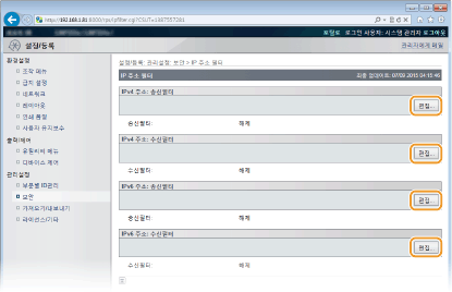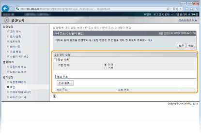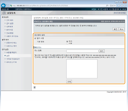![]() 예외에서 설정된 IP 주소 편집 [예외 주소] 아래에서 해당 텍스트 링크를 클릭하고, 표시되는 화면에서 필요에 따라 설정을 변경한 다음, [확인]을 클릭합니다. 예외에서 IP 주소 삭제 삭제할 IP 주소를 선택하고 [삭제] 를 누릅니다. ![]() | ||||