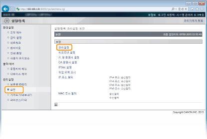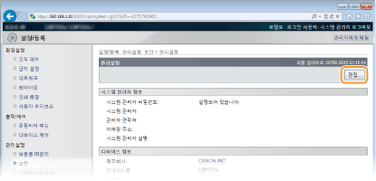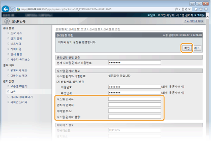 리모트 UI에서 기기의 설정을 변경하려면 관리자 권한이 필요합니다. 아래의 절차에 따라 시스템 관리자 비밀번호를 변경하십시오. 시스템 관리자 비밀번호 설정 정보는 기기의 보안에 매우 중요합니다. 시스템 관리자 비밀번호는 관리자만 알고 있어야 합니다.