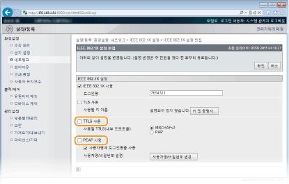 1 | [TTLS 사용] 또는 [PEAP 사용] 확인란을 선택합니다. TTLS의 내부 프로토콜 MSCHAPv2 또는 PAP를 선택할 수 있습니다. PAP를 사용하려면 [PAP] 라디오 버튼을 클릭합니다. |