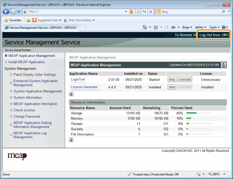 如果关闭 Web 浏览器而未单击 [Log Out from SMS],则暂时无法使用 SMS。