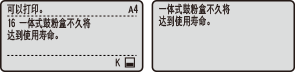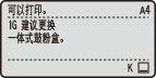 快到一体式鼓粉盒的更换时间时,显示屏上会显示一条消息。请注意,如果继续打印而不采取任何措施,打印质量可能会变差。也可以在显示屏上查看一体式鼓粉盒状态。