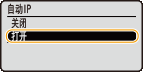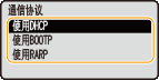 3 | 选择 <使用DHCP>、<使用BOOTP> 或 <使用RARP>,然后按 。 仅可使用 DHCP、BOOTP 和 RARP 之一。如果选定协议设置为 <打开>,另两个协议将自动设置为 <关闭>。 |