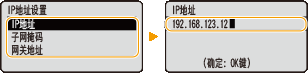 2 | 选择 <IP地址设置>,然后按下 。 |