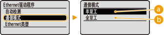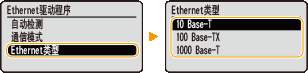 3 | 选择以太网类型。 选择 <Ethernet类型> 选择以太网类型 ![]() ![]() ![]() 选择 <1000 Base-T> 时,<通信模式> 的设置将更改为 <全双工>。 |