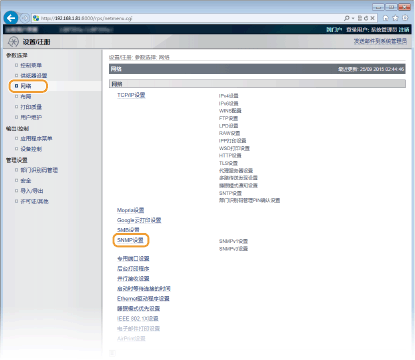 简单网络管理协议(SNMP)是用于通过管理信息库(MIB)监视和控制网络中通信设备的协议。本机支持 SNMPv1 和安全性增加的 SNMPv3。当您打印文档或使用远程用户界面时,可以从计算机检查本机的状态。您可以启用 SNMPv1 或 SNMPv3,或同时启用两者。根据您的网络环境和用途指定各版本的设置。