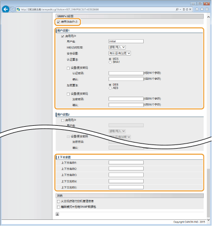 如果选择此复选框,使用 SNMP 协议的应用(如 Canon 软件 imageWARE 系列)可能被禁止访问本机。
