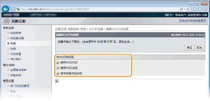 2 | 根据需要配置设置。 ![]() [使用WSD打印] 当使用 WSD 进行打印时,选择该复选框。当不使用时,取消选择该复选框。 [使用WSD浏览] 选择此复选框可通过 WSD 从计算机获取关于本机的信息。当选择 [使用WSD打印] 复选框时,将自动选择此复选框。 [使用多路传送发现] 选择此复选框可将本机设置为回复多路传送发现讯息。如果取消选择此复选框,即使多路传送发现讯息在网络上传播,本机也将保持睡眠模式。 |