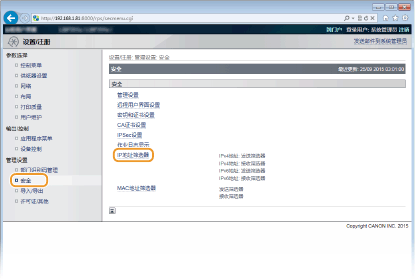 2 | 指定例外地址。 在 [注册地址] 中输入 IP 地址(或 IP 地址范围),然后单击 [添加]。 ![]() 检查是否有输入错误 如果错误输入 IP 地址,则可能无法从远程用户界面访问本机,此时需要将 <地址筛选器> 设置为 <关闭>。地址筛选器 ![]() 当选择 [默认策略] 下的 [拒绝] 时 无法过滤环回、多路传送和广播包。 从例外中删除 IP 地址 选择一个 IP 地址,然后单击 [删除]。 ![]() | ||||