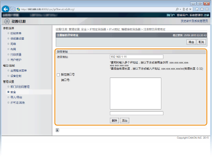 2 | 指定例外地址。 在 [注册地址] 中输入 IP 地址(或 IP 地址范围)。 要指定端口号,请选中 [指定端口号] 复选框,然后在 [端口号] 中输入端口号,再单击 [添加]。 ![]() ![]() 检查是否有输入错误 如果错误输入 IP 地址或端口号,则可能无法从远程用户界面访问本机,此时需要将 <地址筛选器> 设置为 <关闭>。地址筛选器 ![]() 若要删除设置的端口号 选择要删除的端口号,并单击 [删除]。 ![]() | ||||