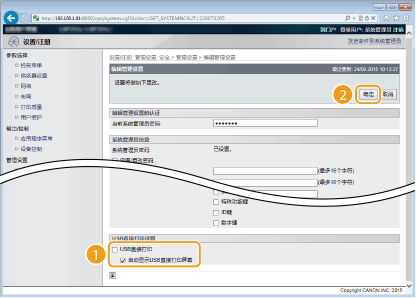 取消选择该复选框以禁用从 USB 存储设备直接打印。选择该复选框启用从 USB 存储设备打印。如果还选择 [自动显示USB直接打印屏幕] 复选框,将在 USB 存储设备插入本机时自动显示 USB 直接打印画面。