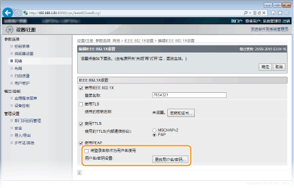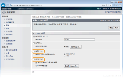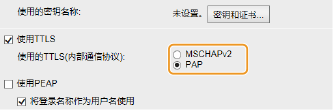1 | 选择 [使用TTLS] 或 [使用PEAP] 复选框。 用于 TTLS 的内部协议 可选择 MSCHAPv2 或 PAP。如果要使用 PAP,请单击 [PAP] 单选按钮。 |
