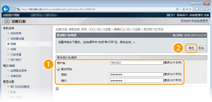 3 | 设置用户名/密码,然后单击 [确定]。 [用户名] 输入字母数字字符的用户名。 [更改密码] 要设置或更改密码,请选中此复选框并在 [密码] 和 [确认] 文本框中输入字母数字字符的新密码。 |