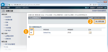 2 | 选择要使用的密钥对并单击 [默认密钥设置]。 查看密钥对或证书的详细信息 您可以检查证书的详细内容,或单击 [密钥名称] 下相应的文本链接或证书图标核实证书。 验证密钥对和数字证书 |