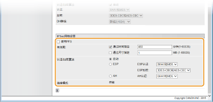 指定在 IPSec 通信期间添加到数据包的 ESP 和 AH 的设置。ESP 和 AH 不得同时使用。也可以选择是否启用 PFS 加强安全性。