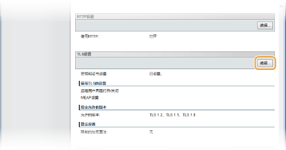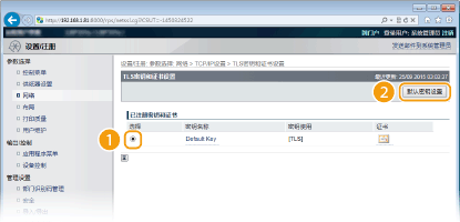 如果已通过 [远程用户界面设置] 或 [IPP打印设置] 启用了 TLS,则不会显示 [默认密钥设置]。要更改使用的密钥,请参阅步骤 6 并分别取消选中 [远程用户界面设置] 或 [IPP打印设置] 子的 [使用TLS] 复选框。