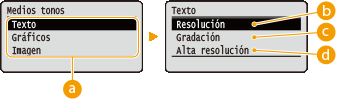 Seleccione el tipo de datos de imagen cuyas opciones se modifican. Seleccione <Texto> para caracteres, <Gráficos> para líneas y figuras, o <Imagen> para imágenes, como fotos.