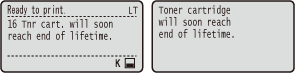 Quando a mensagem <O cart. toner atingirá fim vida útil logo.> é exibida, a impressão é temporariamente interrompida. Para retomar a impressão, pressione  (  ). A mensagem a ser exibida depende da configuração de <Ação Quando Aviso> no menu de configuração do painel de operação. Ação Quando AvisoVocê pode definir qualquer valor como a porcentagem de quantidade restante no cartucho de toner que acionará esta mensagem. Cro Ver Toner Esp |