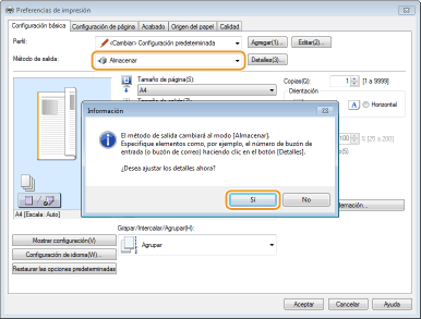 Seleccione [Almacenar] en [Método de salida] y haga clic en [Sí].