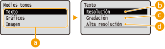 Seleccione el tipo de datos de imagen cuyas opciones se modifican. Seleccione <Texto> para caracteres, <Gráficos> para líneas y figuras, o <Imagen> para imágenes, como fotos.