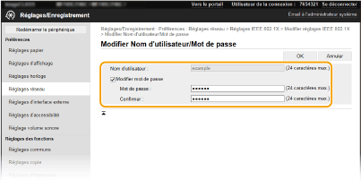 3 | Définissez le nom d'utilisateur/mot de passe. [Nom d'utilisateur] Saisissez le nom d'utilisateur en caractères alphanumériques. [Modifier mot de passe] Pour définir ou modifier le mot de passe, cochez cette case et saisissez un mot de passe en caractères alphanumériques dans les zones de texte [Mot de passe] et [Confirmer]. |