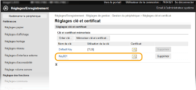 Il est impossible de supprimer une clé avec certificat en cours d'utilisation pour une fonction, comme par exemple lorsque « [TLS] » ou « [IEEE 802.1X] » s'affiche sous [Utilisation de la clé]. Dans un tel cas, désactivez la fonction ou remplacez la clé avec certificat utilisée avant de la supprimer.