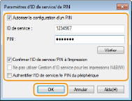 Cliquez sur ce bouton pour vérifier si l'ID et le PIN saisis sont corrects. Cette fonction n'est pas disponible si l'appareil et l'ordinateur sont connectés par un port USB ou WSD (Web Services on Devices).