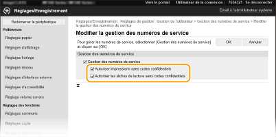Si la case est cochée, vous pouvez sélectionner <Ordinateur> ou <Scanner distant> sur l'écran principal et numériser des documents depuis un ordinateur à tout moment. Si la case n'est pas cochée, vous ne pouvez pas numériser des documents depuis un ordinateur si la fonction d'ID de service est activée. Il est impossible de restreindre la numérisation de documents depuis un ordinateur pour des ID de service particuliers.