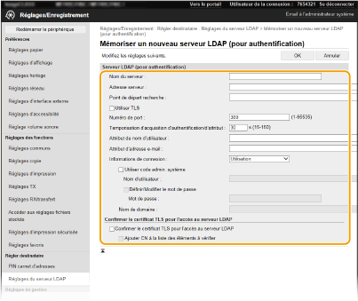 Les serveurs LDAP doivent être enregistrés séparément soit pour la recherche soit pour l'authentification. Pour utiliser un serveur pour la recherche de destinataire de fax et d'e-mails, enregistrez-le pour la recherche, et pour l'utiliser pour l'authentification pour l'envoi d'e-mail ou de fax, enregistrez-le pour l'authentification.