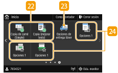 ![]() | <Opciones papel>Este botón se utiliza para especificar el tamaño y el tipo de papel cargado en el casete y en la bandeja multiuso. Especificación del tamaño y tipo de papel <Portal móvil>Utilícelo para establecer una conexión con un dispositivo móvil. Conectar con dispositivos móviles <Opc. de pant. de inicio>Permite cambiar el orden en el que se muestran los botones de la pantalla Inicio. Personalización de la pantalla Inicio <Actualizar firmware>Le permite actualizar el firmware a través de Internet. Actualización del firmware <Copia de carné>Utilice esta función para copiar el anverso y el reverso de un carné de conducir u otro tipo de tarjeta en el mismo lado de una hoja de papel. Realizar copias de carné <Copia de pasaporte>Permite copiar varios pasaportes en una hoja. Realizar copias de pasaporte <Guía de funcionamiento>Pulse para obtener ayuda sobre el funcionamiento y las causas/soluciones del error. |